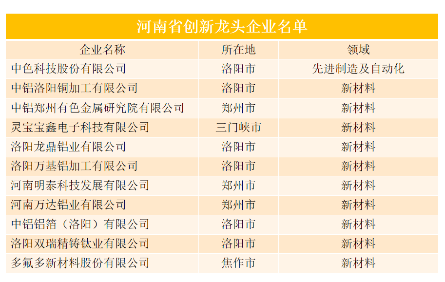 近日,河南省科学技术厅发布《关于公布河南省创新龙头企业名单的通知》。为持续强化我省企业科技创新主体地位,加快培育一批创新水平高、发展速度快、成长性好的创新引领型企业,提升我省产业发展水平,省科技厅、省发展改革委、省财政厅、省税务局共同组织遴选了166家河南省创新龙头企业。新材料领域企业54家,其中有色金属及相关企业10家。该称号有效期三年(2025-2027年)。