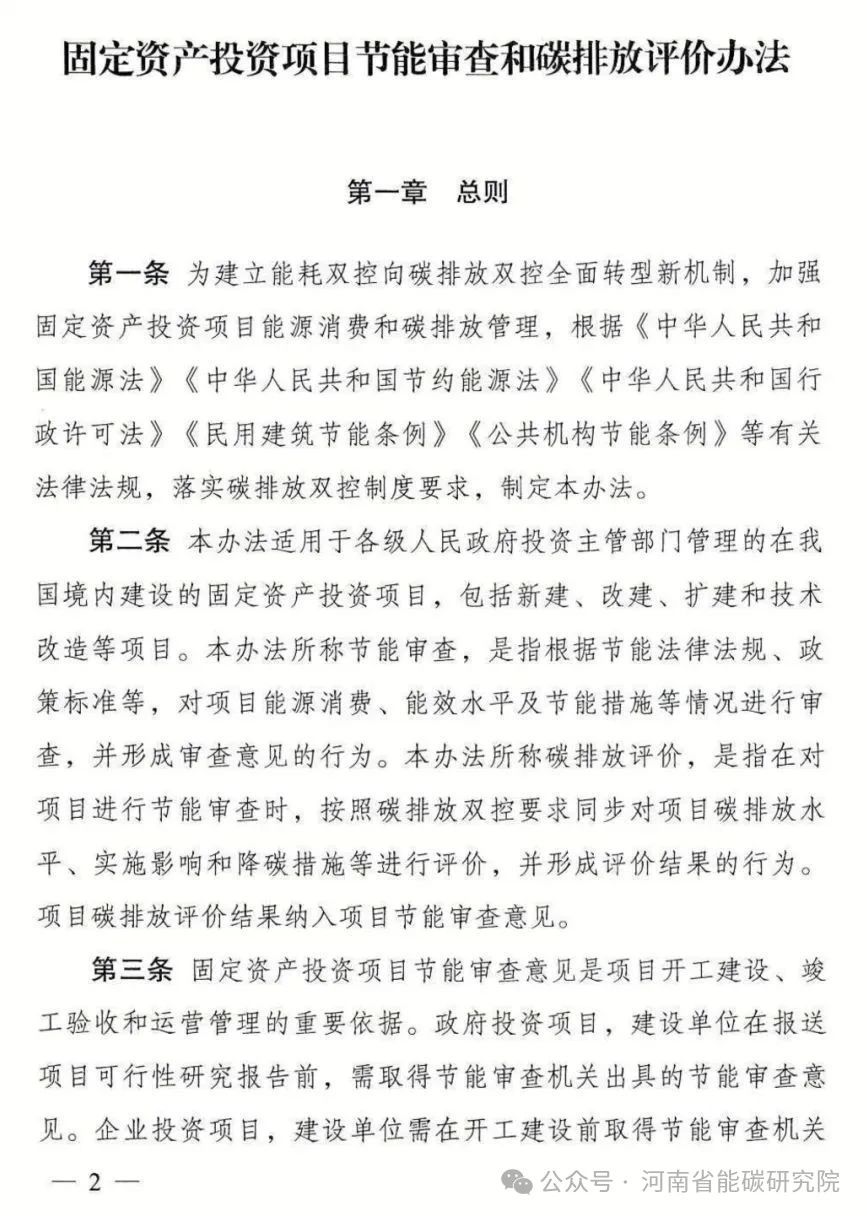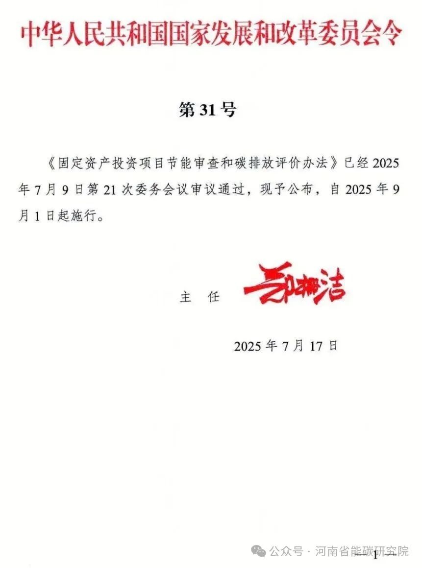 《固定资产投资项目节能审查和碳排放评价办法》自2025年9月1日起施行